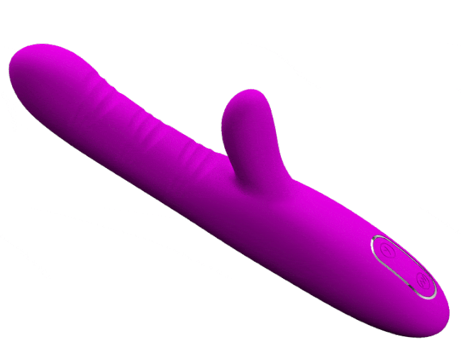Лиловый вибростимулятор-кролик с подвижной головкой и вибрирующим клиторальным отростком.